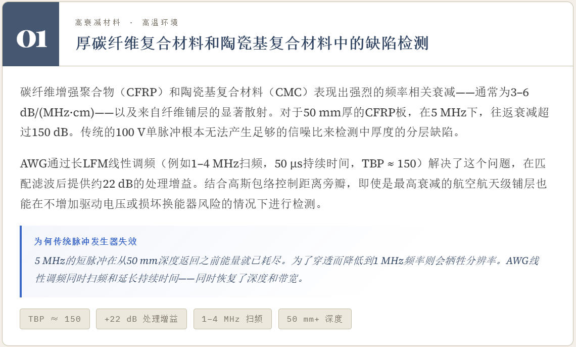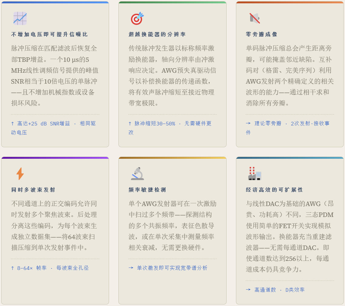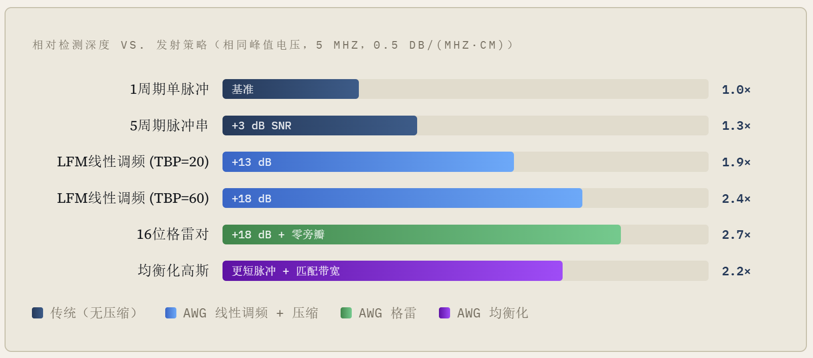 图(1)展示了在代表性衰减介质(0.5 dB/(MHz·cm))中,不同发射策略在相同峰值驱动电压下对可达检测深度的影响。AWG脉冲压缩方法可弥补由安全性和硬件电压限制带来的深度损失。