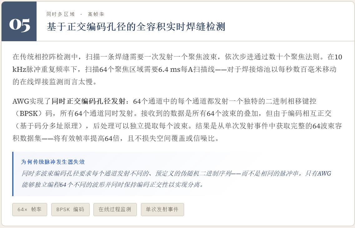 任意波形激励的阵列超声技术在多个检测应用场景具体其独有的优势。而基于三态发射器的PDM脉冲密度调制任意波技术在实际工程化中具有显著优势。可预见在未来的科研和工程化领域基于PDM技术的任意波形阵列超声检测技术的应用会越来越多。