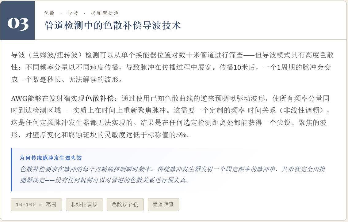 传统的超声波检测仪发射器采用尖脉冲激励或单频方波激励。尖脉冲激励优点在于可以实现宽频高频激励但因激励能量较弱目前仅有高频超声设备尚采用该技术作为激励;单频方波激励通常激励超声换能器中心频率处的单频脉冲;这从根本上限制了超声检测获取的信息量。而任意波形激励可以打破这一限制;对于提升信噪比;检测效率;检测深度和轴向分辨率有明显改善。